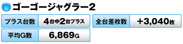 両機種の半数近くがプラス台、特に『ゴーゴージャグラー2』の稼働が7,000G弱と高く、両機種の全台差枚数は+2,000~3,000枚クラスとなった。