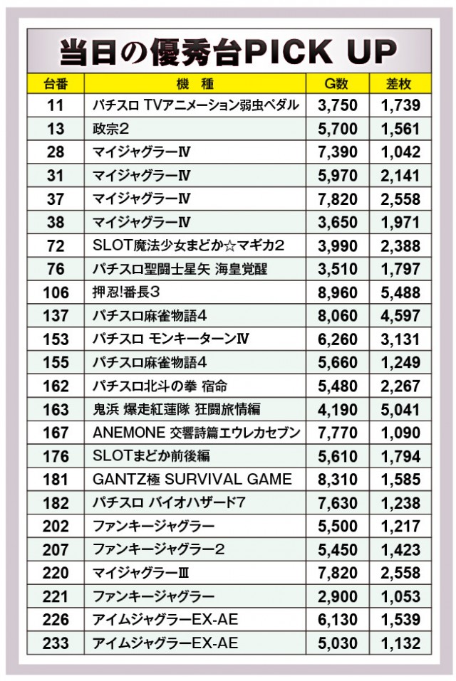 優秀台はご覧の通り。差枚+5,488枚をマークした『押忍!番長3』を筆頭に、『鬼浜爆走紅蓮隊 狂闘旅情編』、『パチスロ モンキーターンⅣ』、『SLOT魔法少女まどか☆マギカ2』、『マイジャグラーⅣ』など多彩な機種が活躍。また、新台の『パチスロ麻雀物語4』、『パチスロANEMONE 交響詩篇エウレカセブン HI-EVOLUTION』もしっかり期待に応えていた。