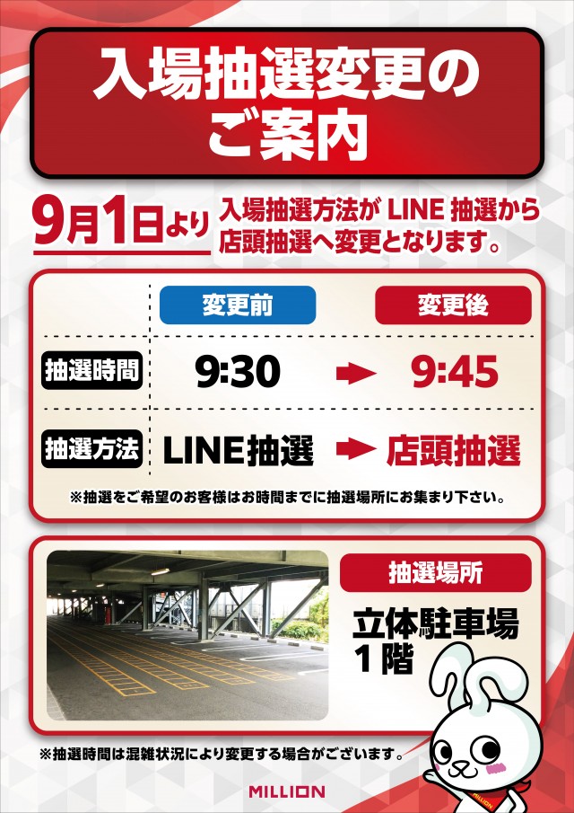9:45より立体駐車場1階にて、入場抽選を行ないます。(抽選時間変更の場合があります。SNS等で告知をご覧ください) |