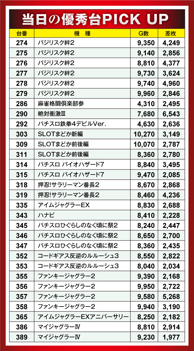 「英雄」リニューアルの前後含めて&フェニックスグループ4店舗でも「ヒーローズレポート」初実施となった今回。同店では[1,000円/46枚] スロ全体でトータル差枚数+60,701枚の大勝利を初戦から成し遂げた。また、差枚数ではプラス千枚以上が40台以上生まれる結果となった。グループ全体を含め、注目の新星が「英雄」デビューを果たしたと言ってもいいだろう。
