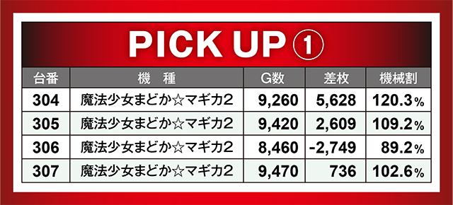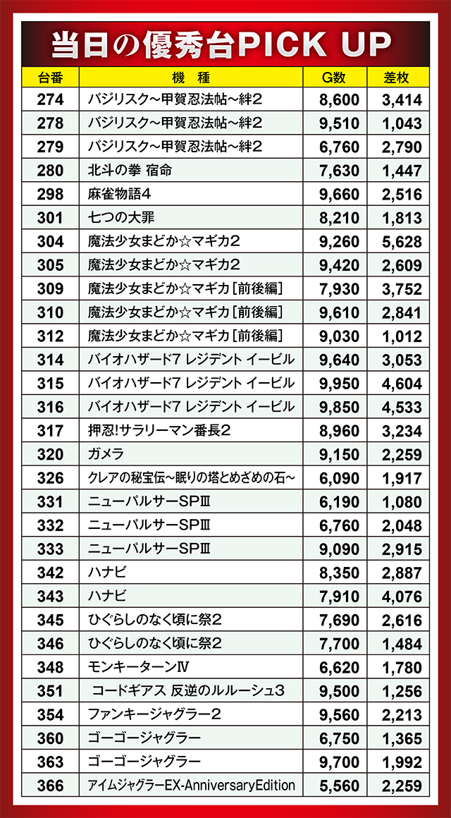 今回は5つの機種をピックアップ。いずれも当代きっての人気マシンであり、2,000枚超え・3,000枚超えなどの羨ましくなる記録がゴロゴロ。残念ながら『まどマギ2』にて1台だけがマイナスとなってしまったが、その反面304番台が5,000枚オーバーを叩き出しているので、チャラにしておこうではないか。