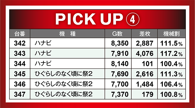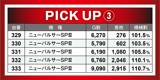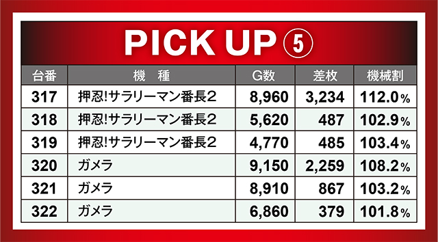 今回も20スロコーナーからめざましい記録が多数誕生し、全120台とは思えないプラス台数を実現。ちなみに、今回ピックアップした5機種24台の平均差枚はなんと+2,035枚。平均機械割は108.0%であった。こうなると、次回にかかる期待が果てしなく大きくなるが、その期待にもしっかり応えてくれることだろう。