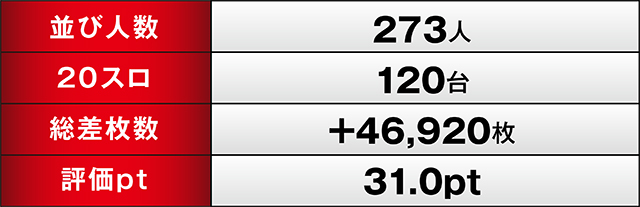 この日、目立った挙動を見せ、見事にプラス域に浮上した台を30台ピックアップ。様々な機種がプラっているのがわかる。それもそのはず、この日の20スロ総差枚は+46,920枚。これを20スロ総台数120台で割ると、その平均差枚はなんと+391枚だった!