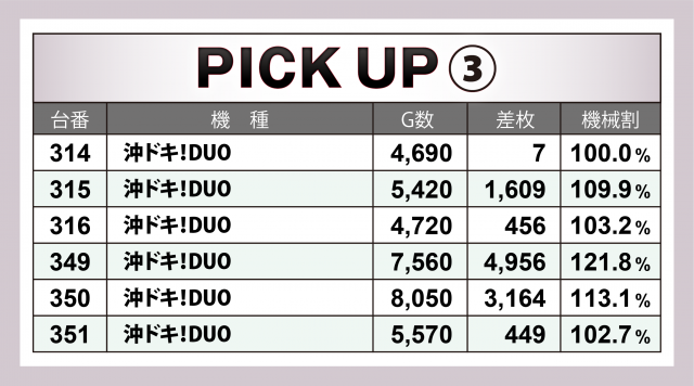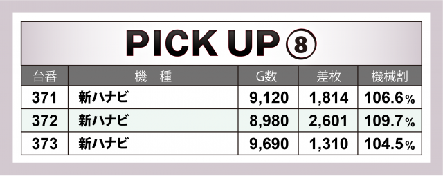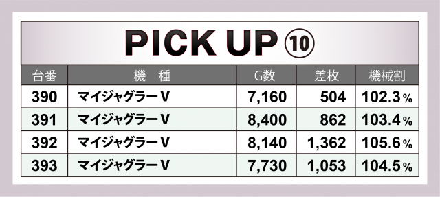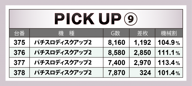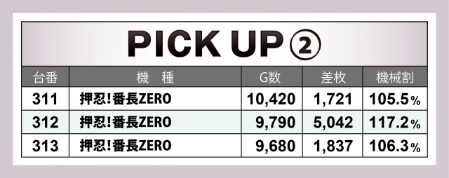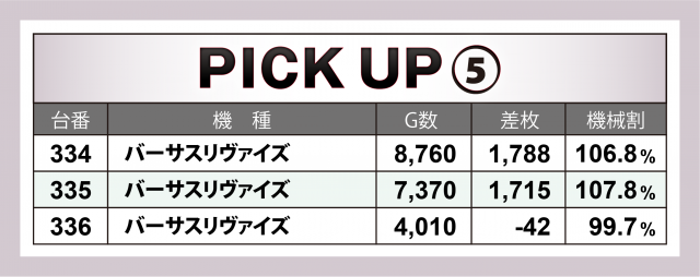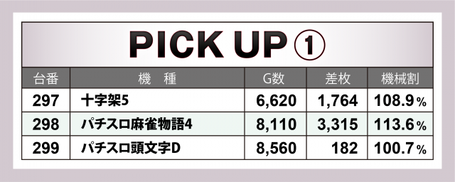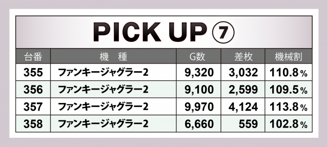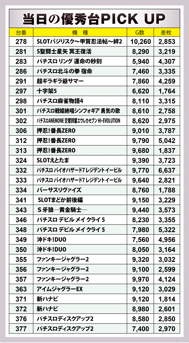 まずは当日の優秀30台PICK UPから。うち26台が差枚数+2千枚以上、18台が+3千枚以上、+5千枚以上が3台! 後述する横並び好況スポット以外では『パチスロ リング 運命の秒刻』『超ギラギラ爺サマー』の+4千枚突破が光った。