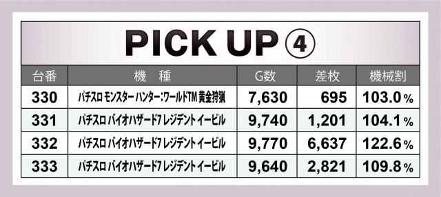 続いては横並び好況スポット。なんと10箇所計38台が対象となり、1台を除いてが全て差枚数プラスに! 中でも高いプラスだったのが+6千枚オーバー台を生んだ『パチスロ バイオハザード7 レジデント イービル』、+5千枚クラスありの『押忍!番長ZERO』『沖ドキ!DUO』『パチスロ デビル メイ クライ 5』、ボーナスタイプながら+4千枚突破台があり大健闘した『ファンキージャグラー2』が躍進を果たした。