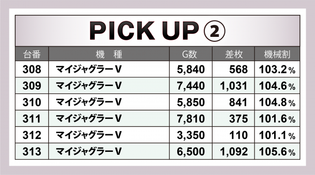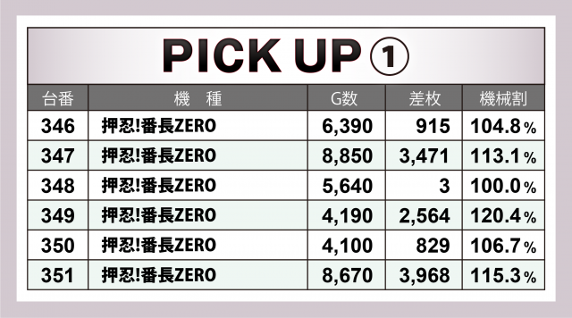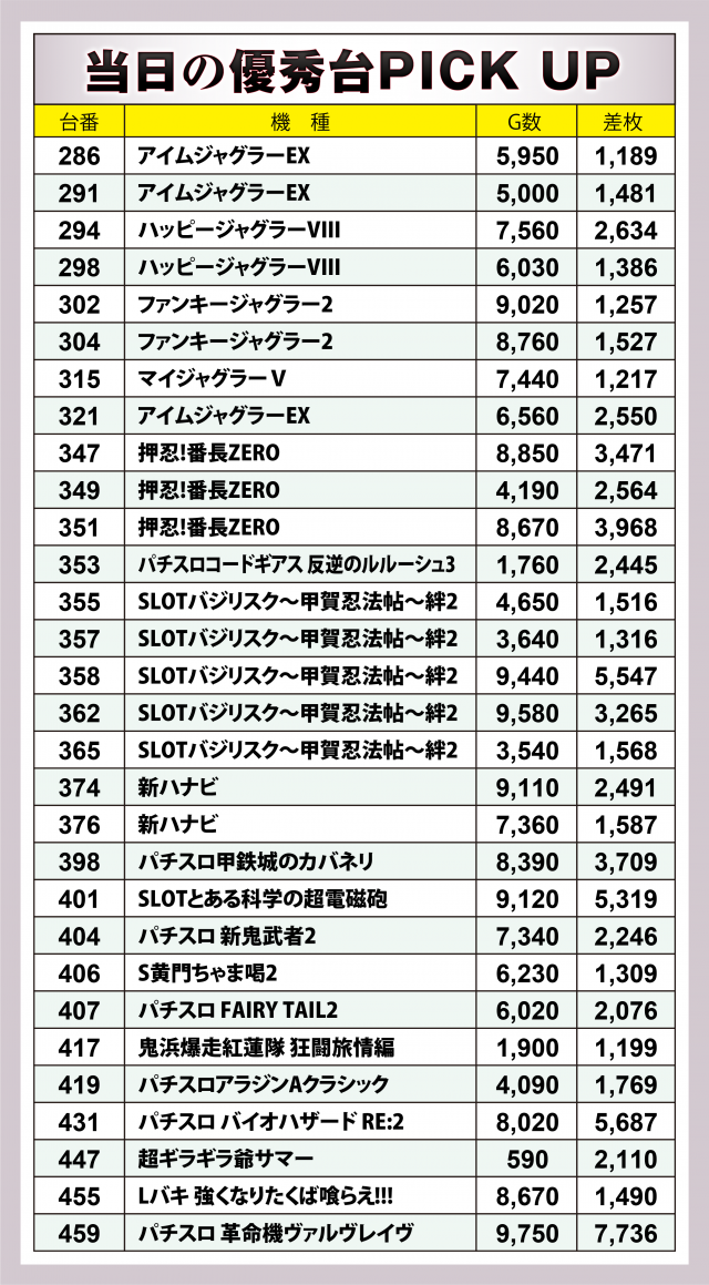 続いては横並び好況スポット2機種をチェック。まず『押忍!番長ZERO』では、+4千枚弱&+3千枚超&+2千枚超をそれぞれ1台ずつ輩出した。また『マイジャグラーⅤ』では6台全てがプラス差枚で終えられた。