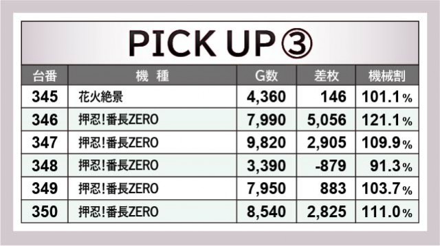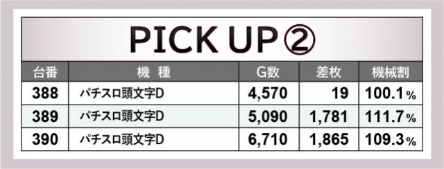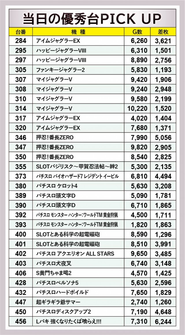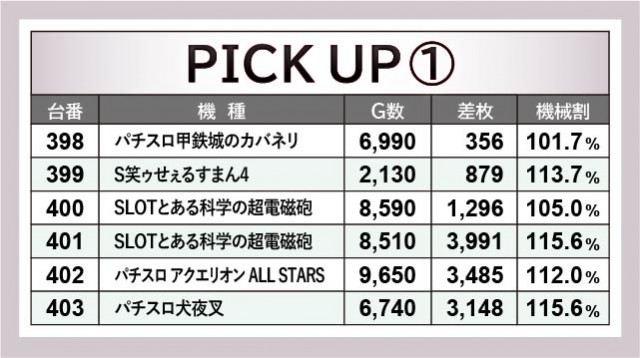 398~403番台の6.5号機で構成された好況スポットは、全台プラス差枚を達成している。『SLOTとある科学の超電磁砲』『パチスロ アクエリオン ALL STARS』『パチスロ犬夜叉』で3千枚OVERが発生し、他にも『押忍!番長ZERO』346番台+5,056枚という凄まじい熱気も見られた。いずれも人気機種が活躍した格好で、同店の意気込みを感じさせられる内容とも言える。