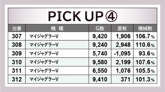 ノーマル機からは『マイジャグラーV』をピックアップ。より多くの回転数が消化されるだけでなく、308番台+2,948枚といった右肩上がりのグラフを描いていた様子が如実に窺えるだろう。コンスタントな大当りも想像できる内容で、遊技していたファンは恍惚の表情を浮かべていたに違いない。