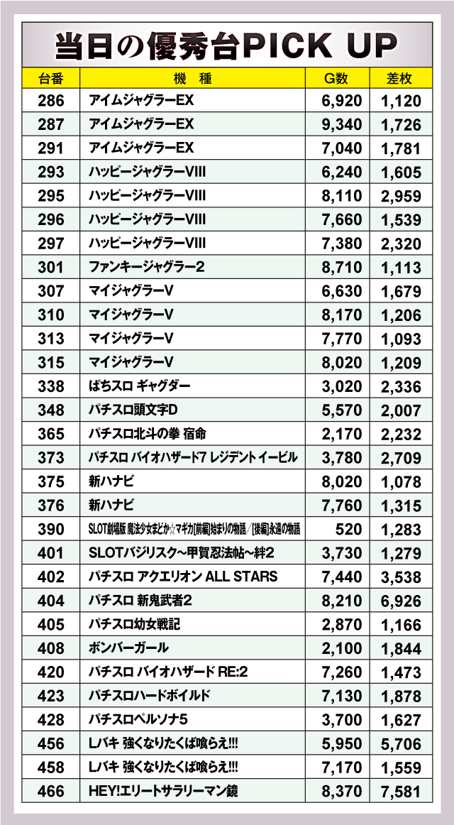 まずは優秀台30台の紹介から。多くの機種が4ケタ以上のプラスで終了していた中、スマスロや6.5号機などのハイスペック機種から好成績を確認。とくに466番台「HEY!エリートサラリーマン鏡」の+7,581枚や、404番台の「パチスロ 新鬼武者2」の+6,926枚などが素晴らしい結果となった。また、ジャグラーシリーズの活躍が目覚ましく、12台/30台がランクインと優秀台の大部分を占めていた。