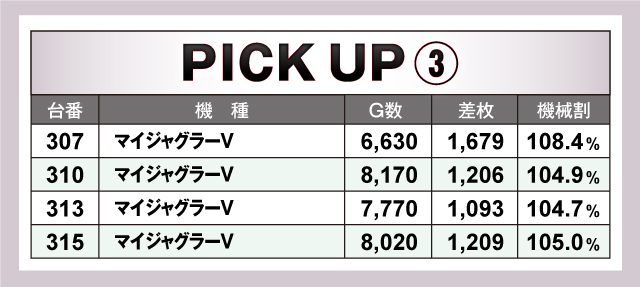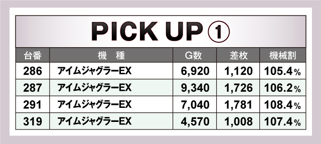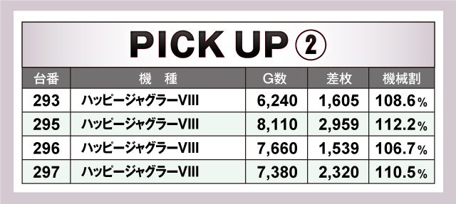 次に紹介したいのは、上記でも取り上げたジャグラーシリーズ。「アイムジャグラーEX」「ハッピージャグラーVIII」「マイジャグラーV」いずれの機種からも4ケタオーバーの台を複数確認でき、またしっかり回転数がついている台が多かったことからも、ベースの高い状況だった可能性が高い。同シリーズにしっかりと力を入れていることが窺えたので、今後もしっかりチェックしていこう!