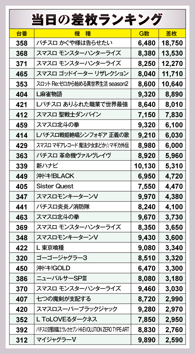 そして『スマスロ ゴッドイーター リザレクション』465番台が+11,710枚。『スロット Re:ゼロから始める異世界生活 season2』353番台が+10,640枚とつづく。以下、『L麻雀物語』404番台が+8,890枚、『Lパチスロ ありふれた職業で世界最強』421番台が+8,010枚と、超優秀台がズラリと並ぶ豪華なランキングが出来上がっていた。