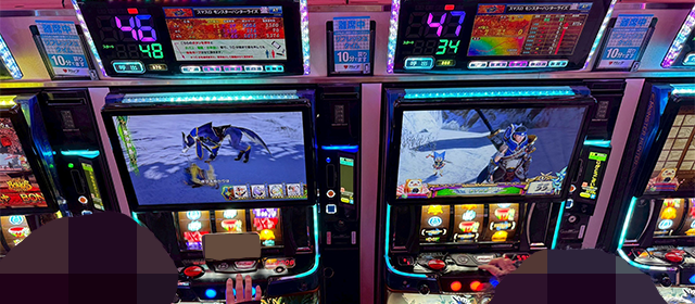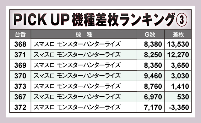 『スマスロ モンスターハンターライズ』は7台中6台がプラス差枚と優秀台の割合が高い。全台がしっかりとしたG数まわされているうえに、2台が万枚オーバーと、この日のMVPクラスの活躍だった。