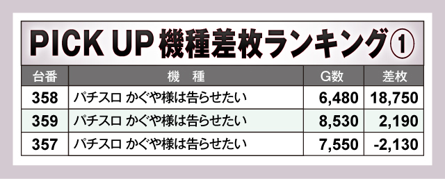 なんとこの日は万枚超えが5台も出現。なかでも頭ひとつ飛び抜けた結果だったのが『パチスロ かぐや様は告らせたい』358番台。+18,750枚と驚異的な差枚を残している。つづいたのが『スマスロ モンスターハンターライズ』の368番台と371番台。それぞれ+13,530枚、+12,270枚とすばらしい成績だった。