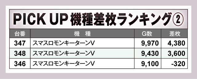 『パチスロ かぐや様は告らせたい』は設置3台中2台がプラス差枚。とくに358番台は総合ランキングでもトップの、+18,750枚という見事な結果を出している。『スマスロモンキーターンV』も3台中2台がプラス差枚で、いずれも9,000G以上まわされていて人気ぶりがうかがえる。