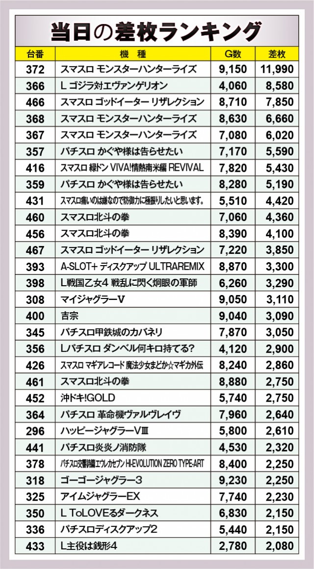 『スマスロ モンスターハンターライズ』にて万枚OVERが発生し、さらに『L ゴジラ対エヴァンゲリオン』から8,000枚OVER、『スマスロ ゴッドイーター リザレクション』も7,000枚OVERと各所で大きな熱気が生まれている。また各所で8~9,000回転台をマークする台が多く、ファンは大きな手応えを感じていた様子だ。好感触を得て力強くレバーを立ちており、有意義な時間を過ごしていたのは間違いない。