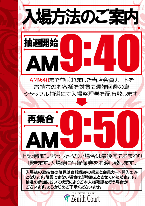 毎朝9:45までにお並びになられたお客様を対象に入場順抽選を実施しております |