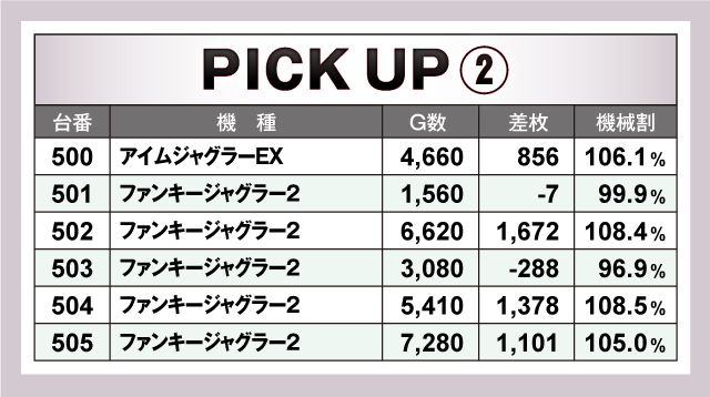 続いては当日好調だった2箇所のカタマリについて見ていこう。どちらのカタマリもジャグラーシリーズがメインのカタマリだが、4桁オーバーが半数以上とかなりの好成績だった。とくにPICK UP①では、回転数10,000Gオーバーと終日ぶん回し状態の2台が軒並み好記録をマーク。しっかりと回される根拠があったのだろう!