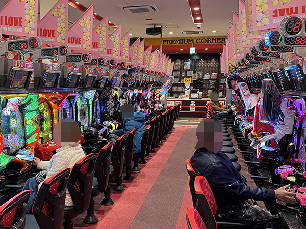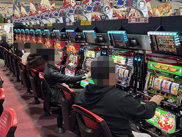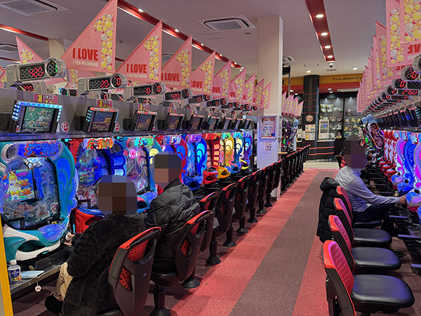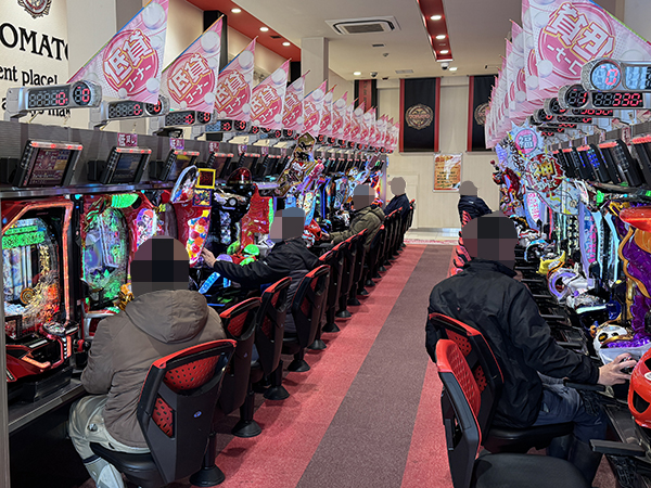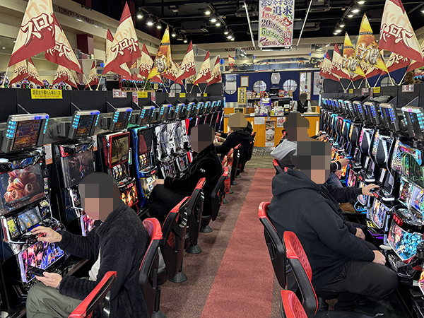 取材時は多くのプレイヤーが来店。パチンコ・パチスロともに、様々な機種が支持を得ていた。