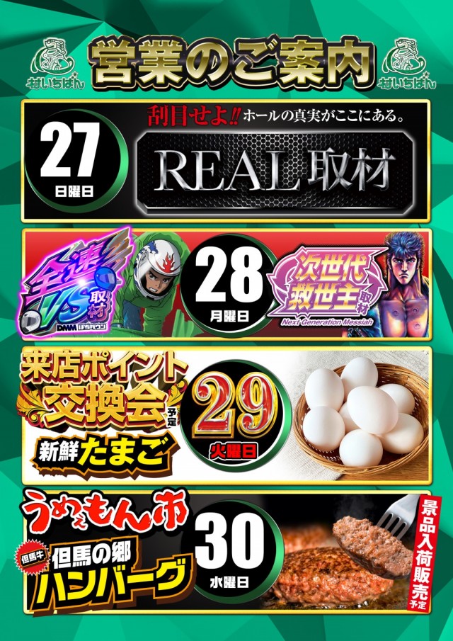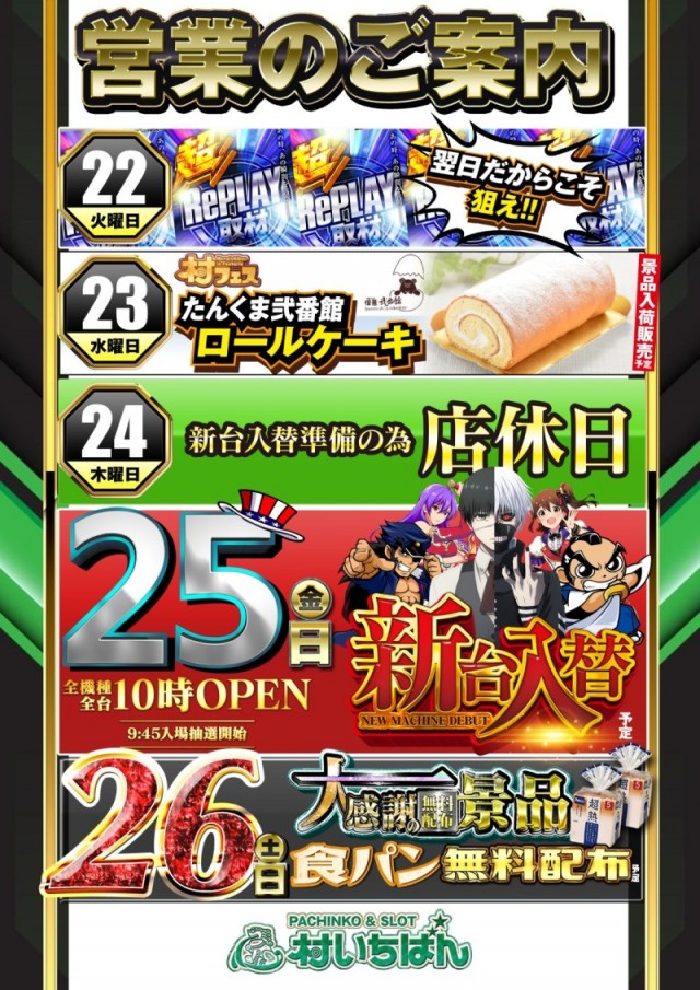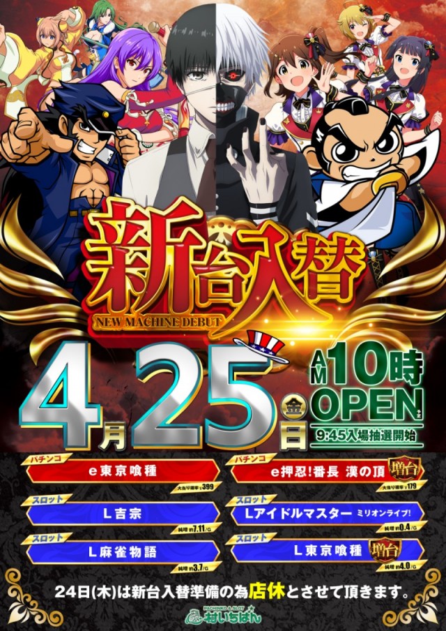 明日24日(木)は新台入替の為店休とさせて頂きます!!