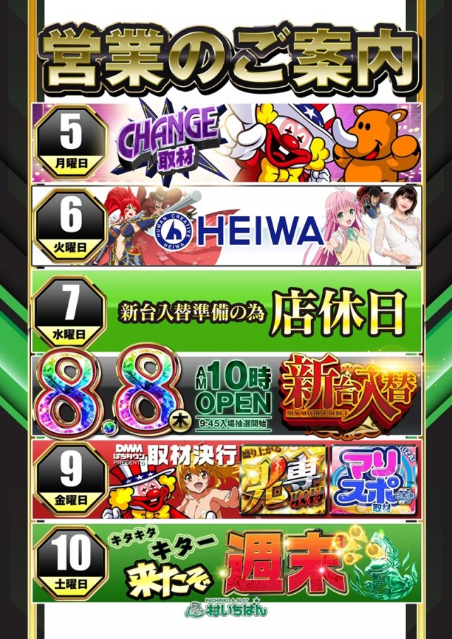 本日7日(水)は新台入替の為店休とさせて頂きます!!