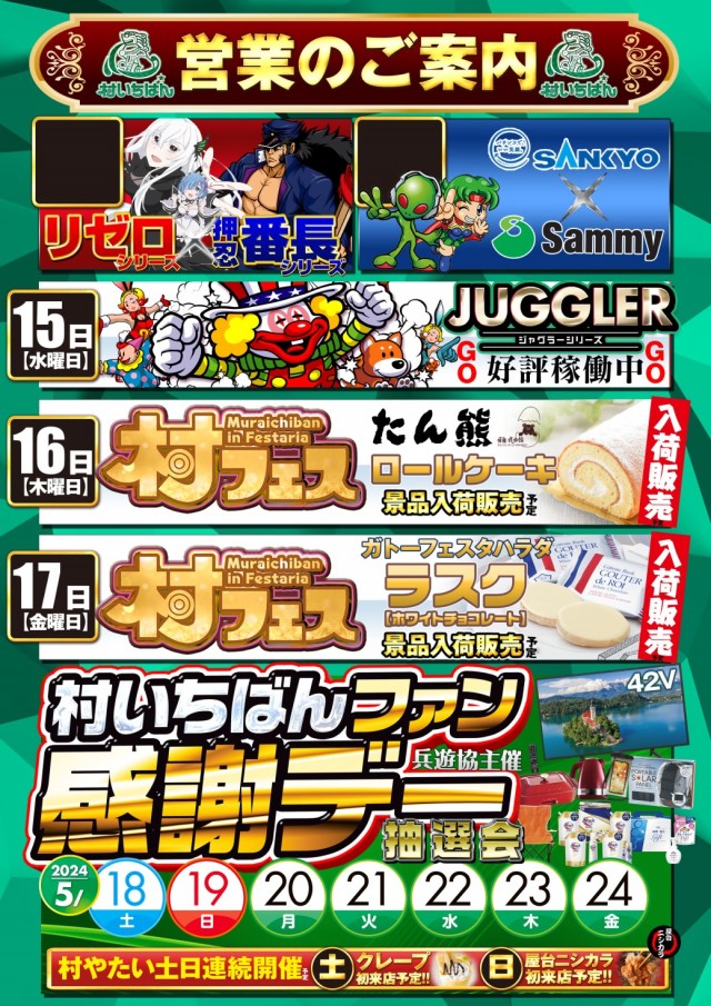 【ジャグラー】15日(水)人気シリーズ好評稼働中【計59台】