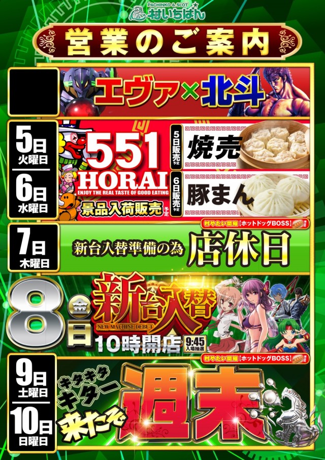 【エヴァ】4日(月)人気機種好評稼働中!!【北斗】