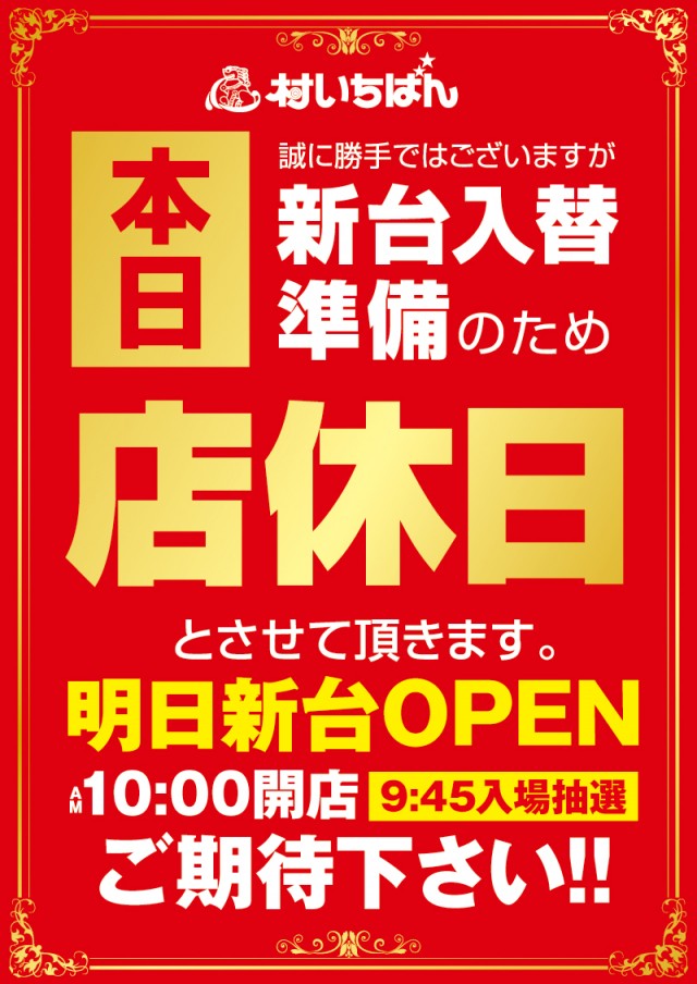 本日は新台入替準備の為店休日です!!