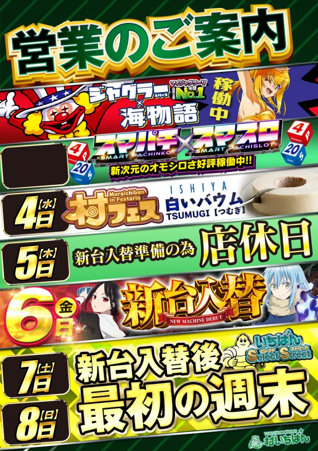 明日5日(木)は新台入替の為店休とさせて頂きます!!