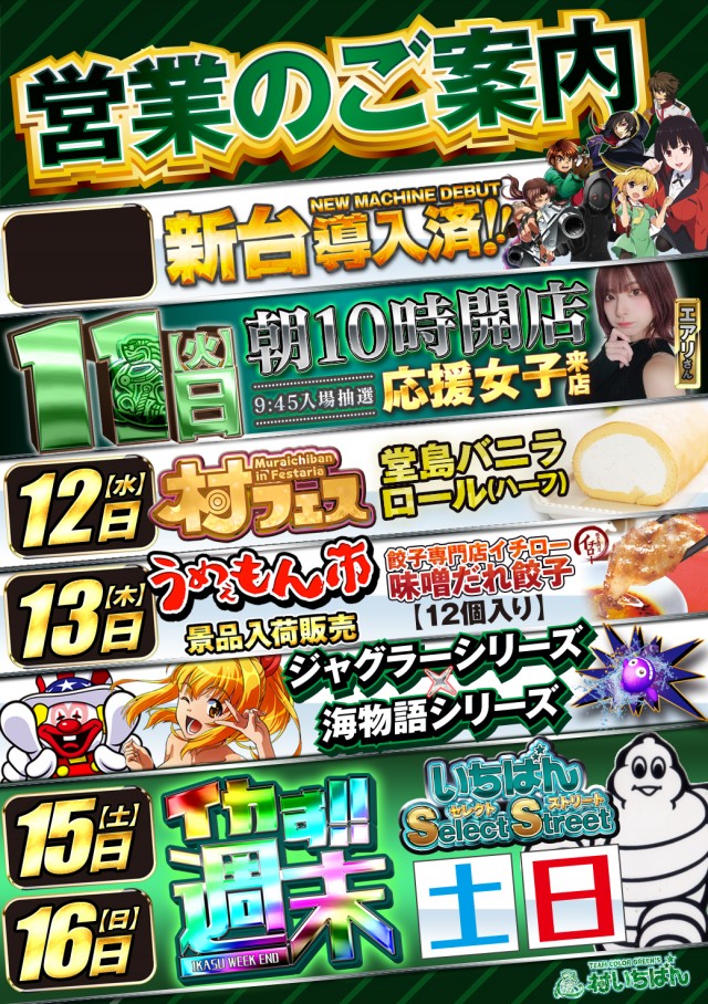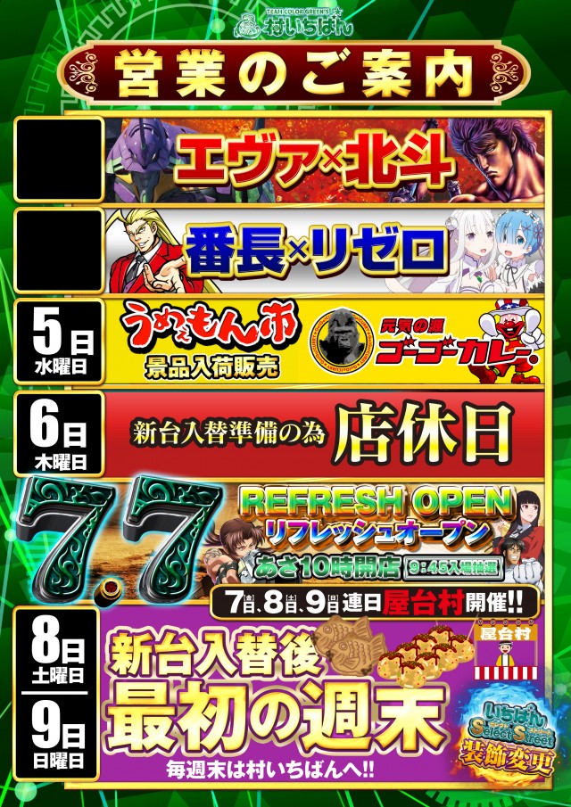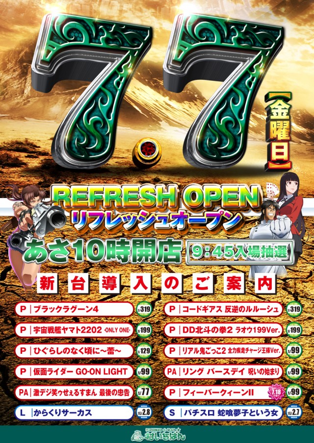 明日7.7日(金)はリフレッシュ&新台オープン!10時開店!