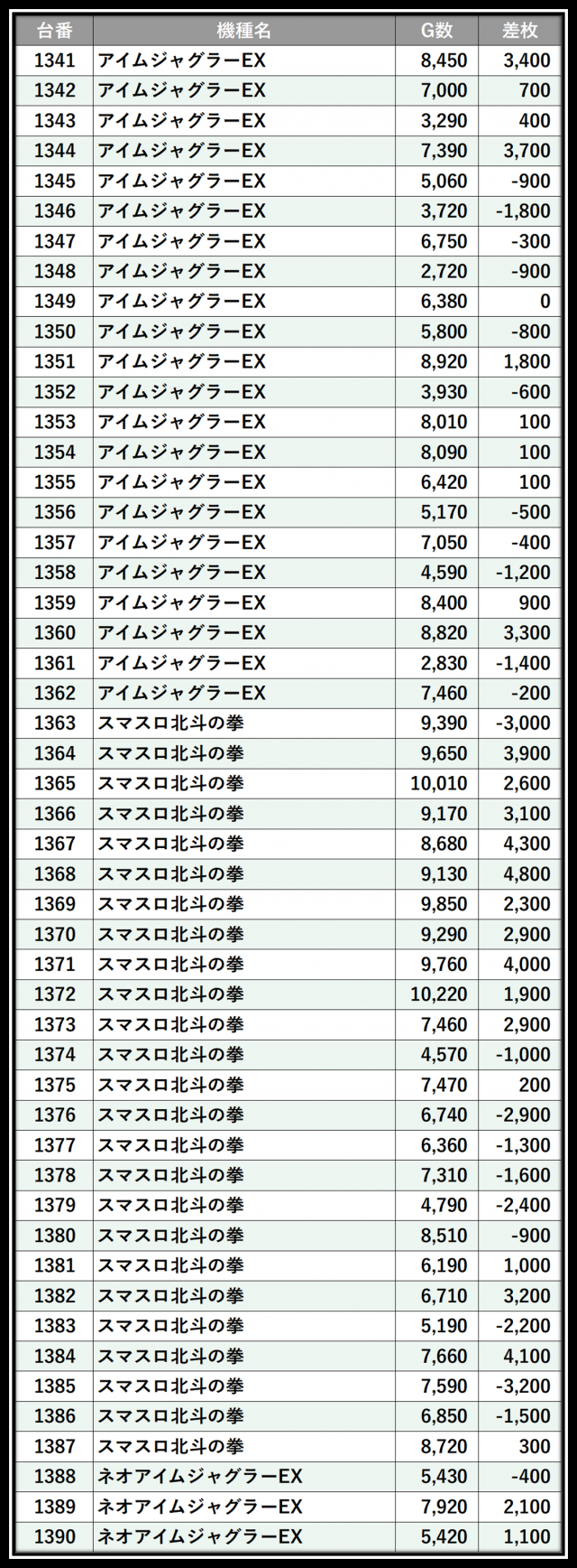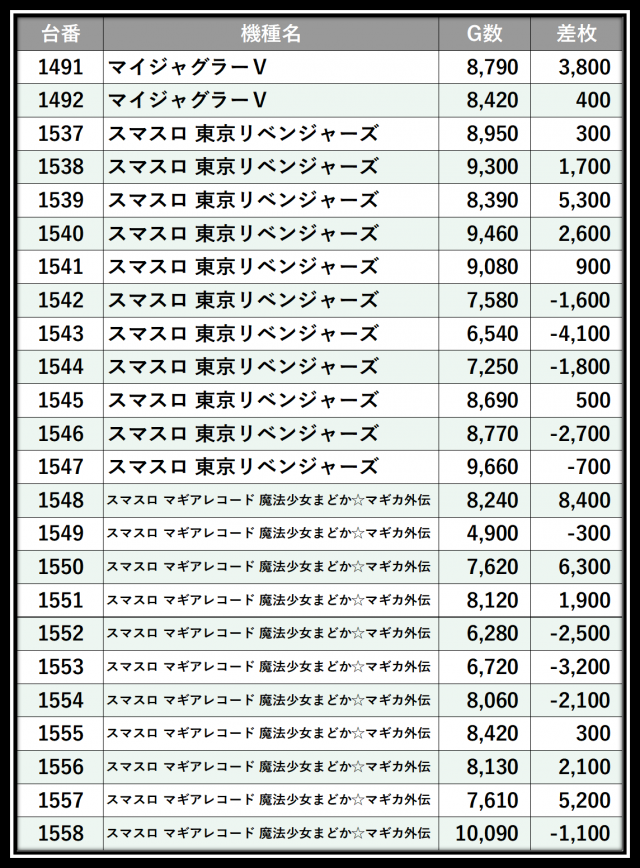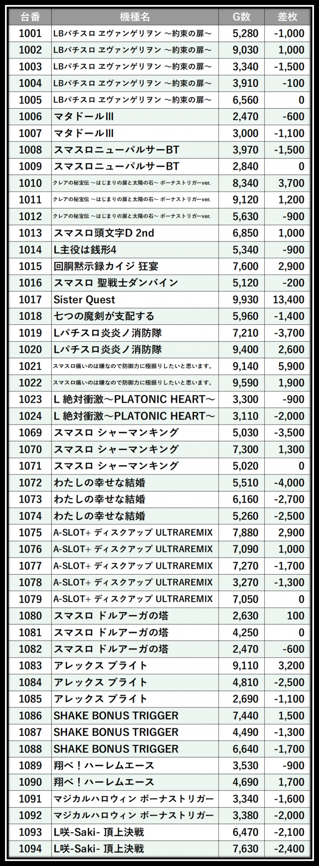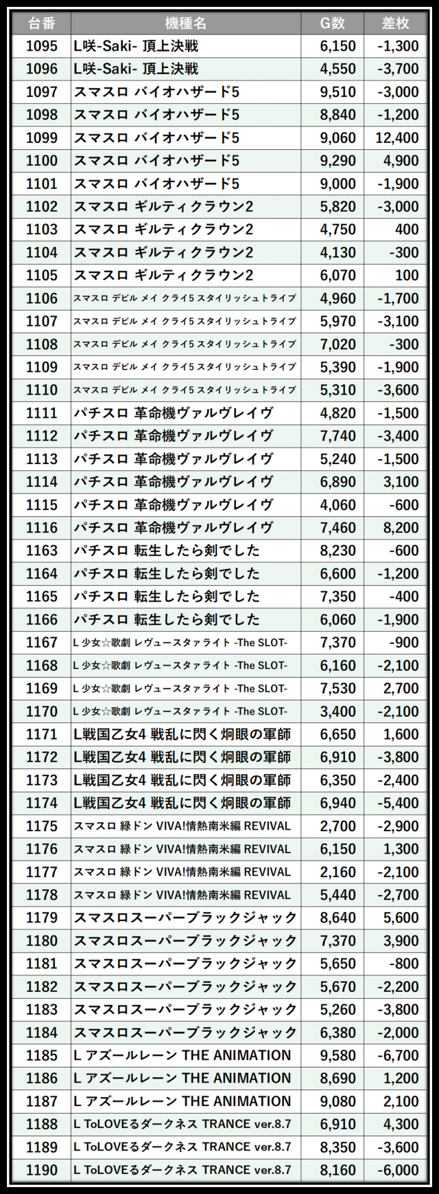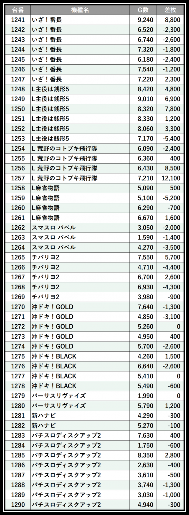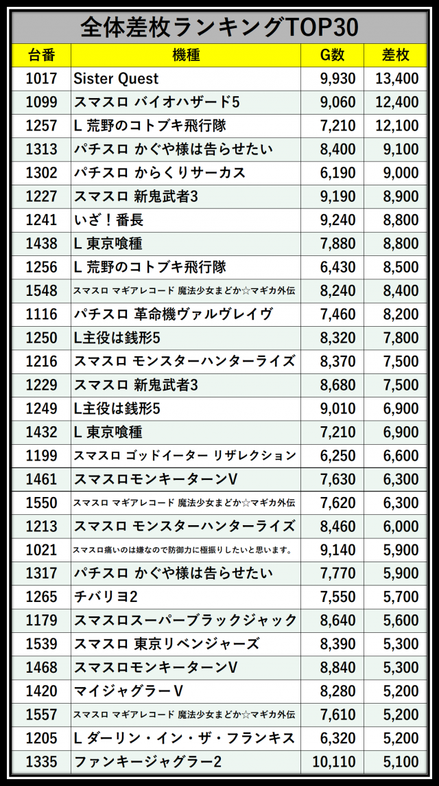 ※差枚数順に掲載しています