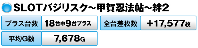 18台中9台がプラスで全台差枚数は+17,577枚、平均G数も7,678Gを記録した。