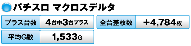 同じく『パチスロ マクロスデルタ』も挙動の良さを見せ、4台中3台がプラスで全台差枚数は+4,784枚という成績を残した。