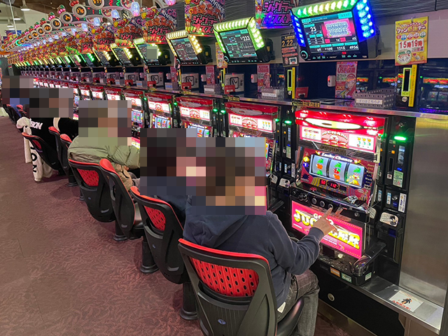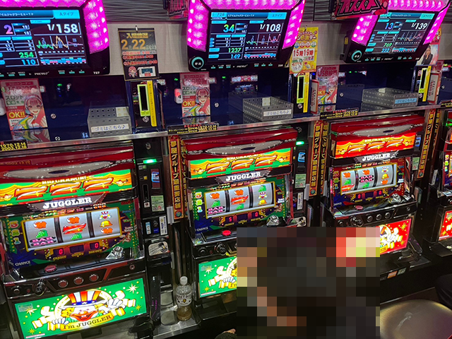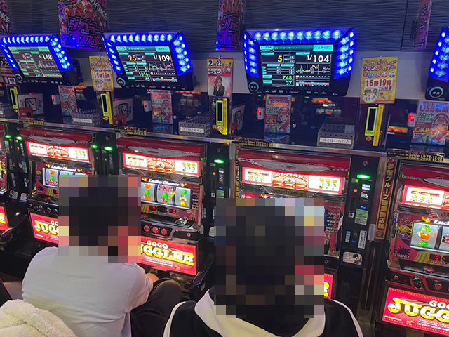 取材時は、「ゴーゴージャグラー3」で、25回や20回のボーナスを獲得している台を確認。