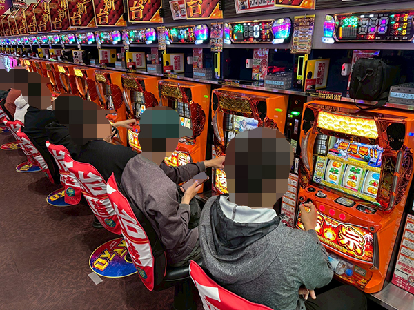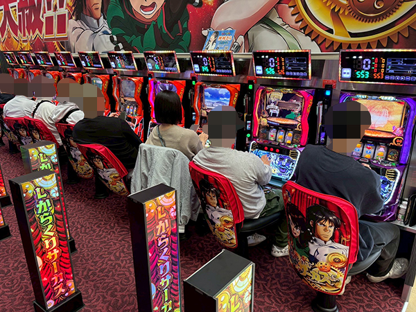 1000円/188枚パチスロの稼働も高い。楽しそうにレバーを叩くプレイヤーの姿を複数目撃している。