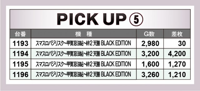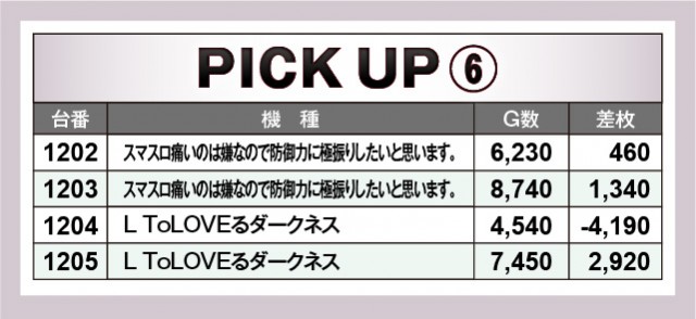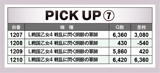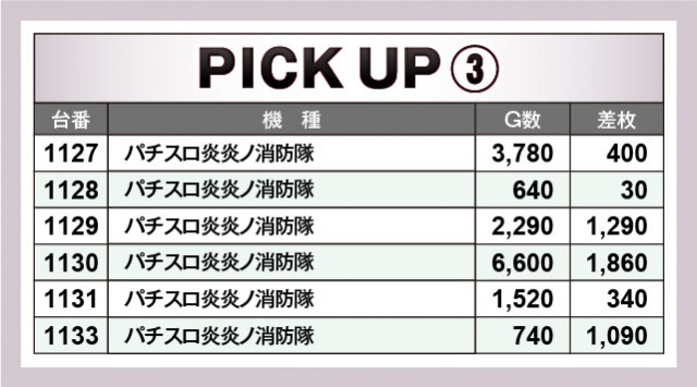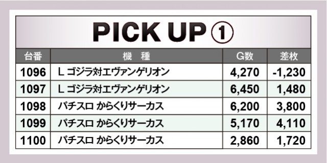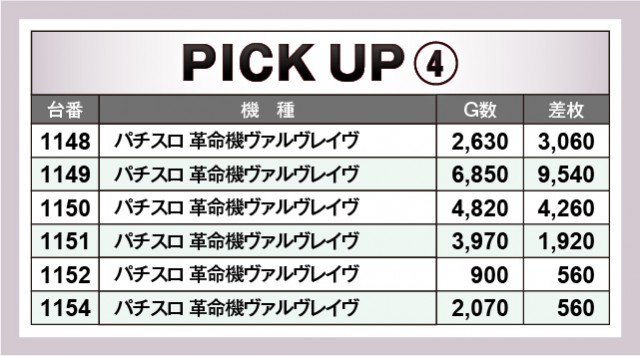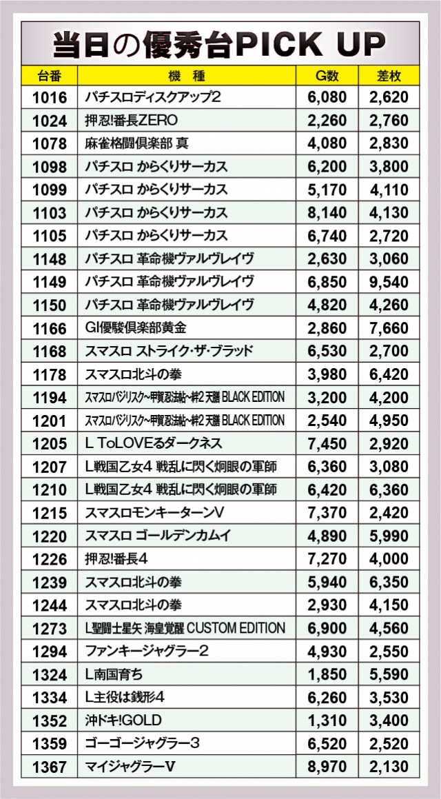 前述したように『パチスロ 革命機ヴァルヴレイヴ』1149番台+9,540枚が鮮烈な記録を打ち立てており、ほかにも『パチスロ からくりサーカス』1099番台+4,110枚や1103番台+4,130枚といった大きな熱量が見られる。大きなマイナスを築いた台が見られず、好況スポットが相当高いポテンシャルを秘めていたのは間違いない。