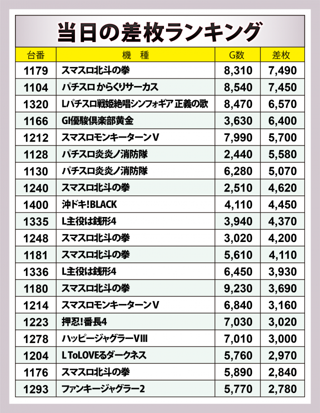まずはこの日の上位20台を見ていこう。20台の全てが+2,000枚以上となった上に、+3,000枚以上は全体の8割強となる17台、+4,000枚オーバーは全体の6割となる12台、+5,000枚オーバーは7台、+6,000枚オーバーは4台、+7,000枚オーバーは2台となった。