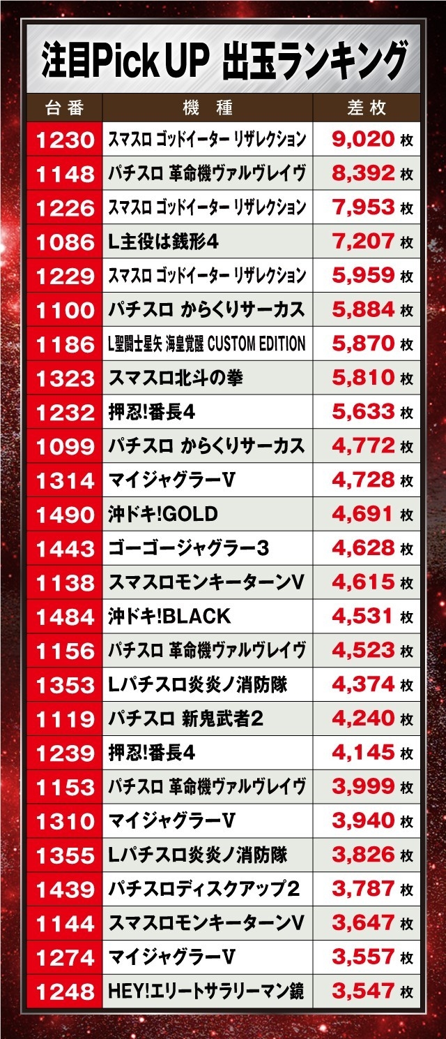 この日はなんと言っても『スマスロ ゴッドイーター リザレクション』が絶好調であった。+9,020枚でランキング1位に輝いた1230番台を筆頭に+7,953枚に+5,959枚と、見事な結果を残しランキングの上位を占めた。