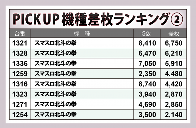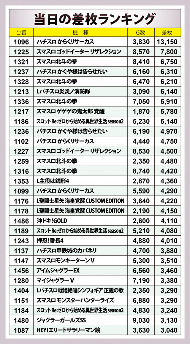 まずは上位30台の成績から。なんと30台の全てが+3,000枚以上をマークした上に、+4,000枚以上は全体の7割となる21台、+5,000枚オーバーは9台、+6,000枚オーバーは6台、+7,000枚オーバーは2台、そして万枚をクリアしたのは1台と、歴代回を上回る高水準を果たした。