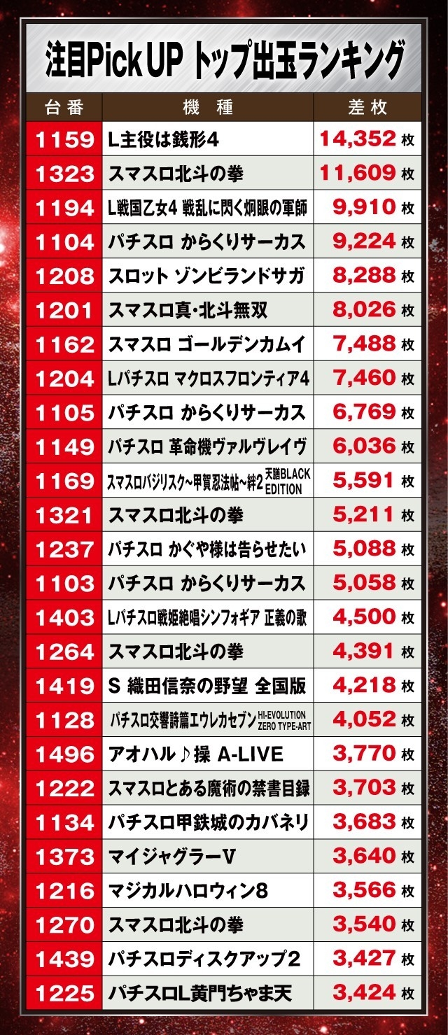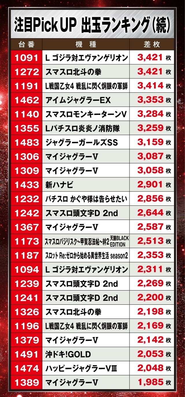 この日は人気のスマスロを中心に好調台を大量に確認できた。そんな中ランキングトップになったのが『L主役は銭形4』で+14,352枚を記録、次いで『スマスロ北斗の拳』も万枚超を達成している。