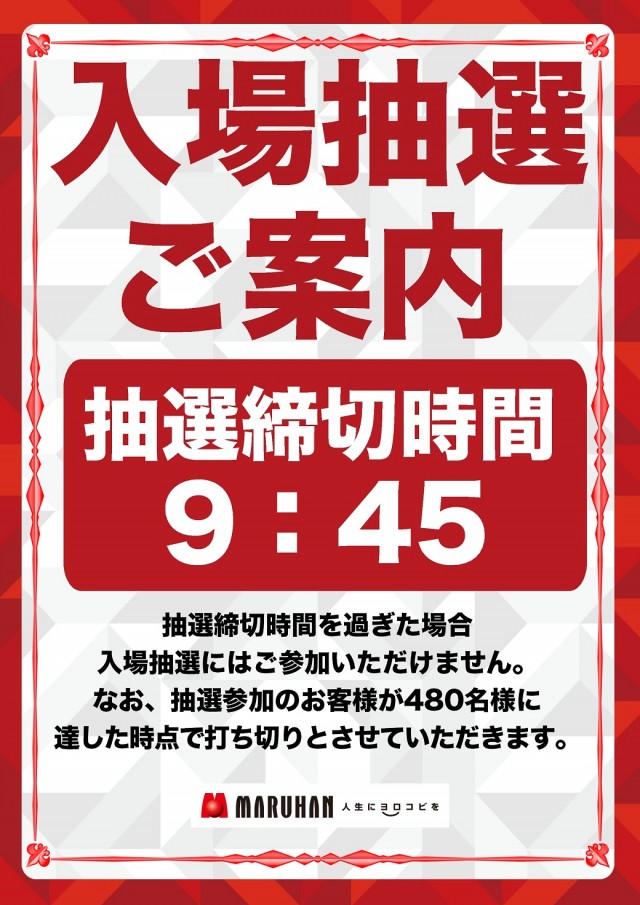 抽選開始時間→9時45分 再集合時間→9時55分 入場時間→10時00分 |