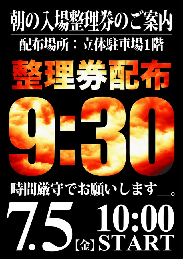 立体駐車場1階にて朝9時30分より入場整理券配布※時間が変更になる場合がございますので「最新情報」をご確認下さいませ |