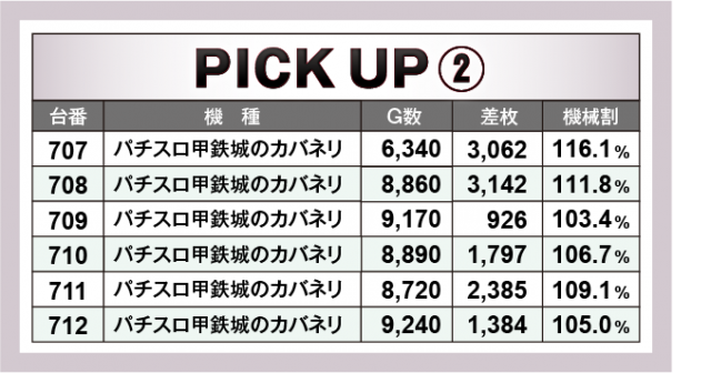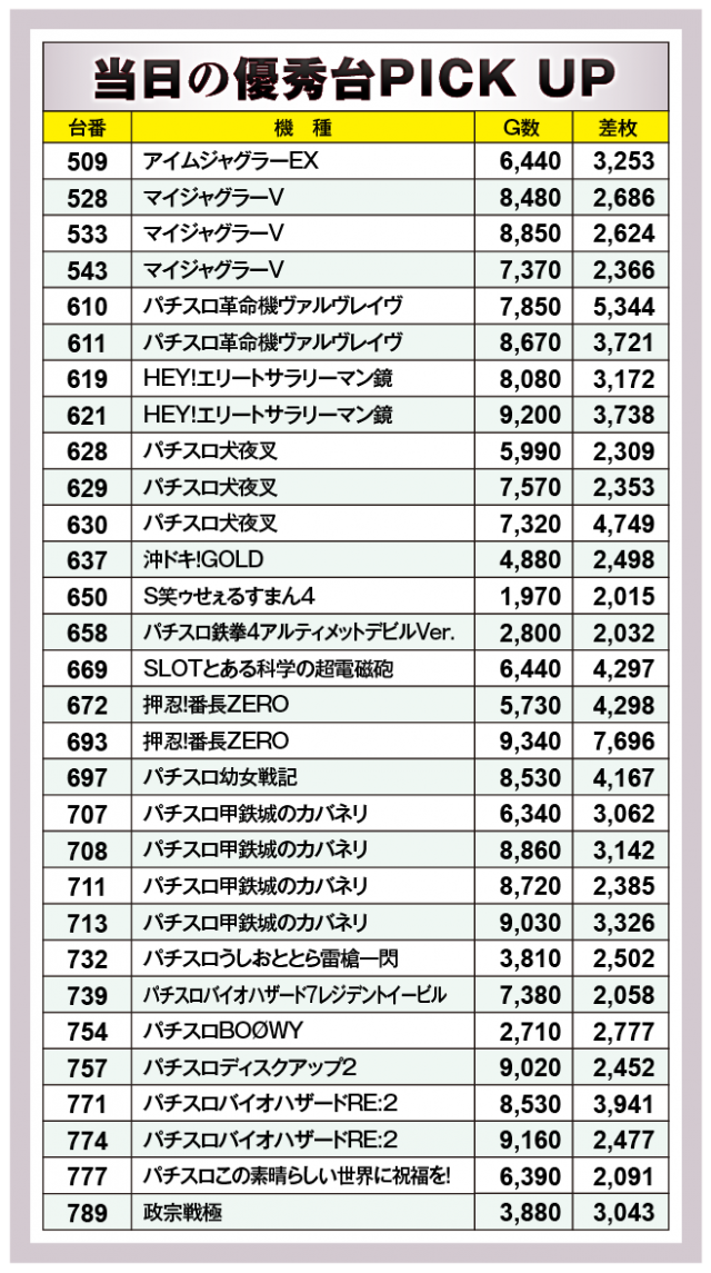 まずは優秀30台のPICK UPから。30台全てが差枚数+2千枚以上、+3千枚以上は15台、+4千枚以上は6台となった。後述する好況スポット以外では、2台並びで目立った『パチスロ革命機ヴァルヴレイヴ』で610番台が+5,344枚と大台を突破!次いで、630番台の『パチスロ犬夜叉』で+4,749枚、697番台の『パチスロ幼女戦記』で+4,167枚の好成績が光った。