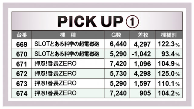 続いては3機種計12台の横並び好況スポットについて。まず『SLOTとある科学の超電磁砲』から『押忍!番長ZERO』の横並びでは、マイナス台が見られたものの+4千枚オーバーが2台輩出され、好記録をマーク。また『パチスロ甲鉄城のカバネリ』では、G数を多く消化しており、6台のトータル差枚数は+1万2千枚オーバーを獲得!両スポット以外でも至る所で好成績がみられ店内全体が熱気に包まれていた。