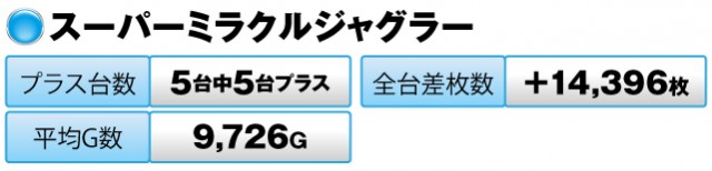 こちらも5台すべてがプラスで全台差枚数は+14,396枚だった。