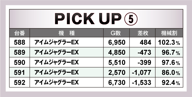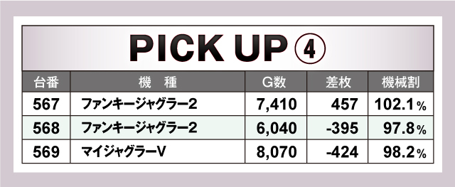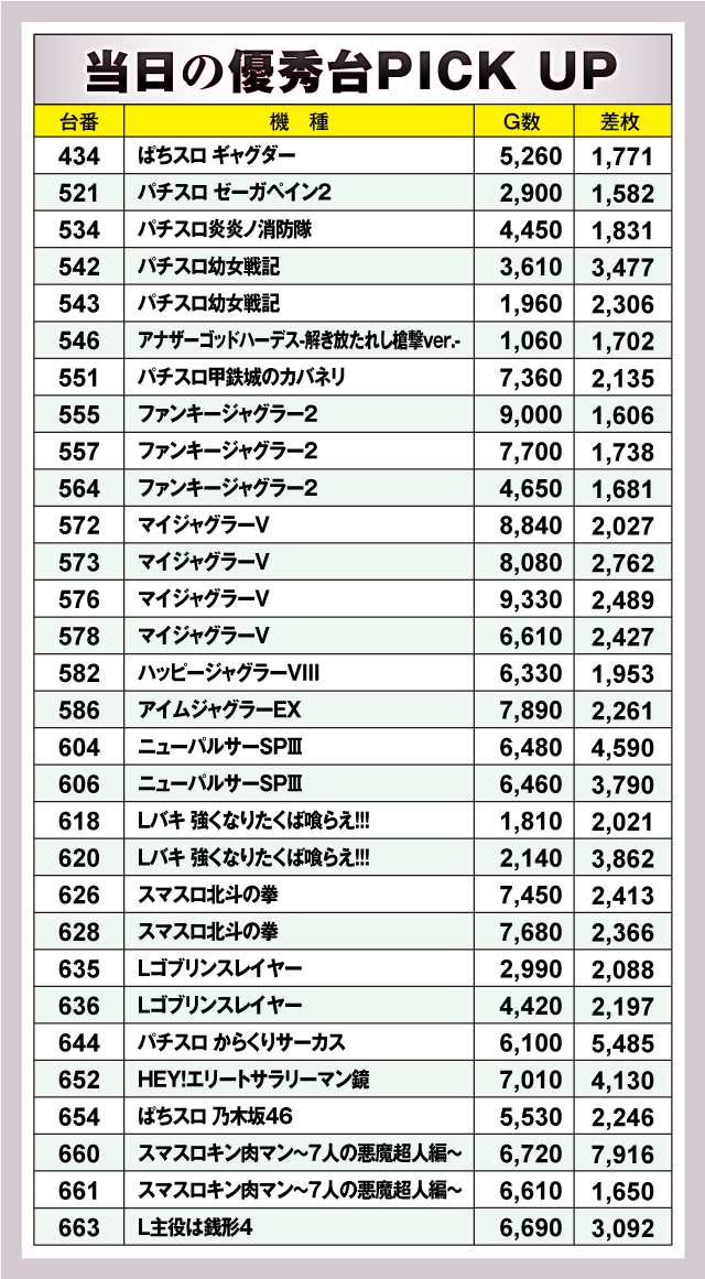 まずは優秀台30台のピックアップから。30台のうち21台が+2,000枚オーバーで、+5,000枚オーバーは2台。最優秀台は、660番台「スマスロキン肉マン~7人の悪魔超人編~」の差枚+7,916枚という結果となった。全体的に多種多様な機種がランクインしていたが、特に目立っていたのはジャグラーシリーズなどのノーマルタイプ。ハイスペック機種に負けじと11台/30台がランクインしていることから、ベースの高さが窺えた!
