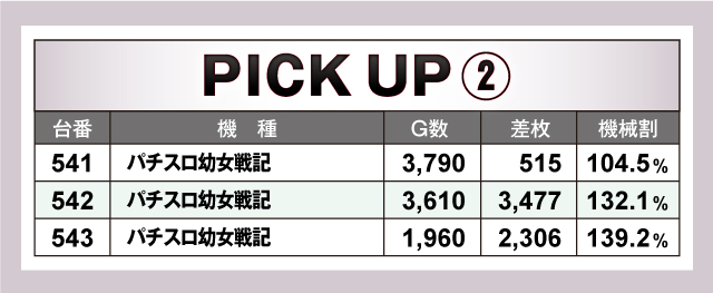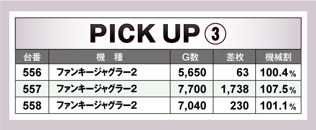 続いては当日3台以上の並びで優秀だった箇所を紹介していこう。上でも取り上げたとおり「ニューパルサーSPⅢ」やジャグラーシリーズなどのノーマルタイプが賑わっており、「ニューパルサーSPⅢ」の平均差枚は+3,187枚と圧倒的だった! また「パチスロ幼女戦記」も3台並びでトータルプラスで終了! 次回実施時は並びに注目して立ち回ってみよう!