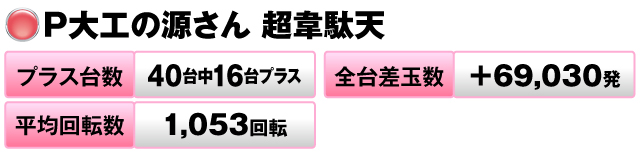 さらには人気絶好調、同店で最多となる40台設置の『P大工の源さん 超韋駄天』もキラリと光る出玉性能で魅せてくれた。