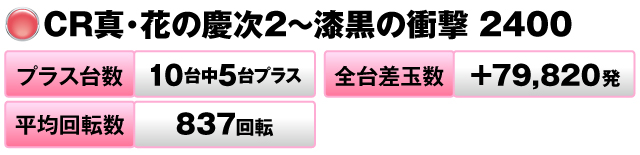 こちらも5台中2台プラス&平均ゲーム数4,000G弱と少なめであったが、差枚数は圧倒の10,000枚突破!