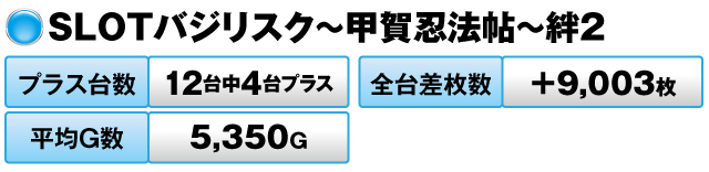 一方、『SLOTバジリスク~甲賀忍法帖~絆2』はプラス台数こそ全体の3分の1と少なめだったが、全体差枚数は9,000枚オーバー!