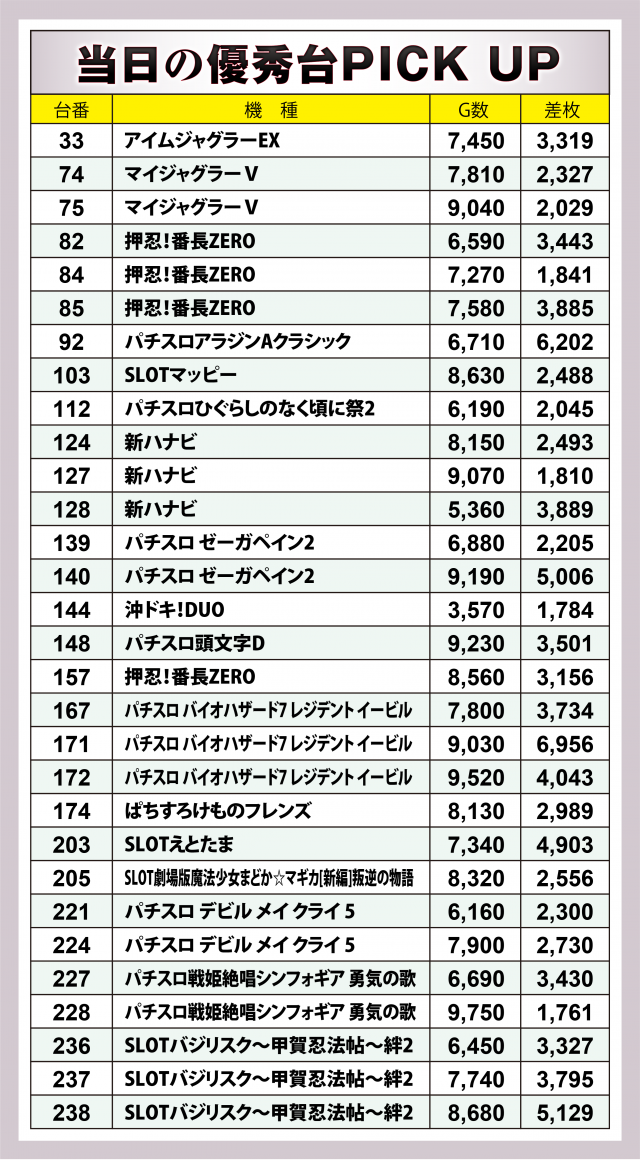 まずは優秀30台のPICK UPから。うち27台以上が差枚数+2千枚以上となり、4台が+5千枚オーバーとなった。後述する好調5機種以外では、+6千枚を突破した『パチスロアラジンAクラシック』や共に+5千枚クラスとなった『パチスロ ゼーガペイン2』『SLOTえとたま』の出玉が光った。